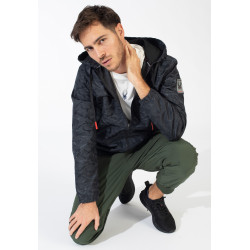 Jas mit „Camouflage“-Druck und Ritssluiting. Trekkoord voor de kap. Zakken aan de zijkanten. Logo von linkermouw.