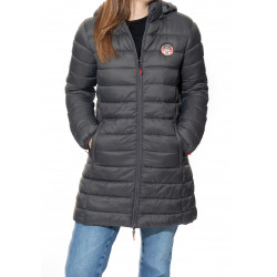 Atika badge long hood fine down jacket for women