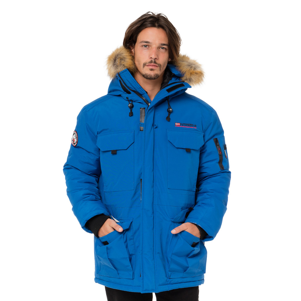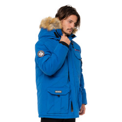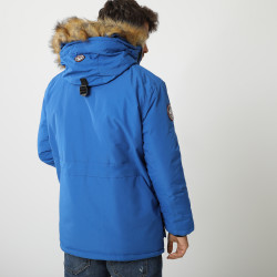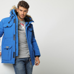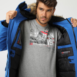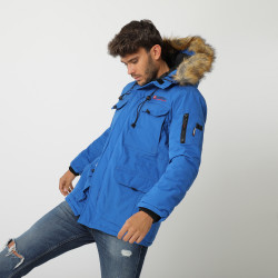 Doudoune Alpes pour homme. Capuche ajustable avec fausse fourrure. Multiples poches pour le rangement. Poche zippée sur la manche. Style alliant fonctionnalité et élégance. Idéale pour les aventures hivernales.
