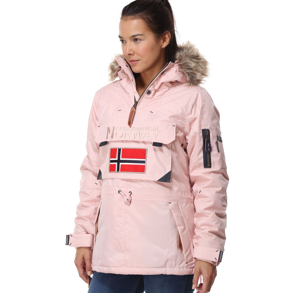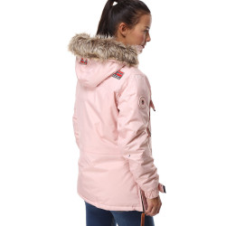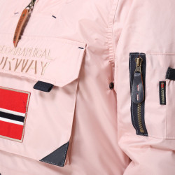 Parka Aubergine pour femme. Marque Geographical Norway. Capuche avec bord façon fourrure. Fermeture zippée. En bas 3 poches à l'avant. Poche zippée sur une manche.
